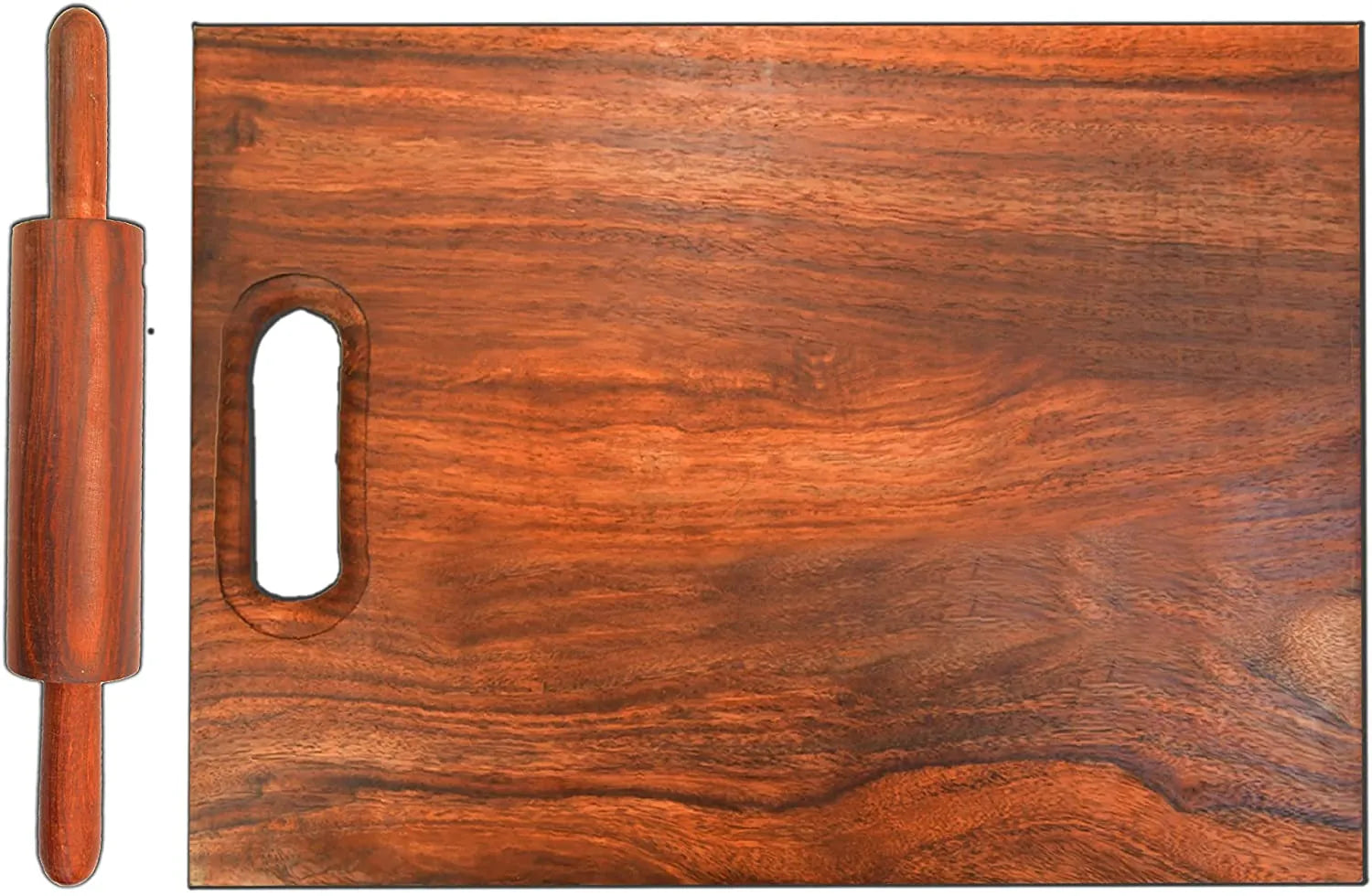 The Anarrio cutting board is a reversible wooden dough rolling board with a juice drip groove. It comes with a rolling pin and is suitable for chopping meat, cheese, and vegetables. The board measures 14x10 inches and the rolling pin measures 14x3 inches.